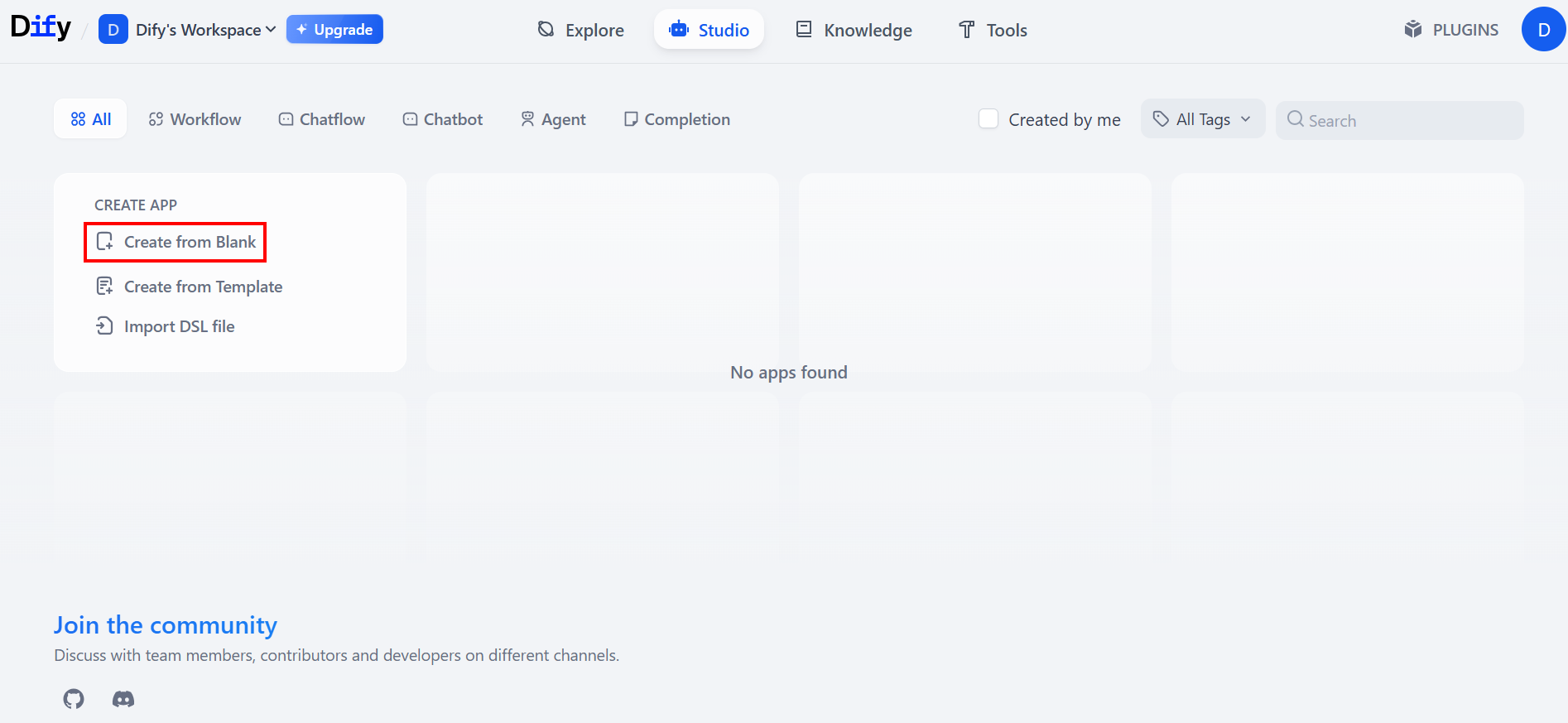 À partir de la page d’accueil de l’espace de travail Dify, créez une nouvelle application en sélectionnant “Create from Blank” (Créer à partir d’une feuille blanche), comme indiqué ci-dessous :