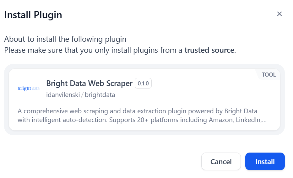 C’est bon ! Le paquet d’intégration de Bright Data est maintenant chargé et installé sur Dify.