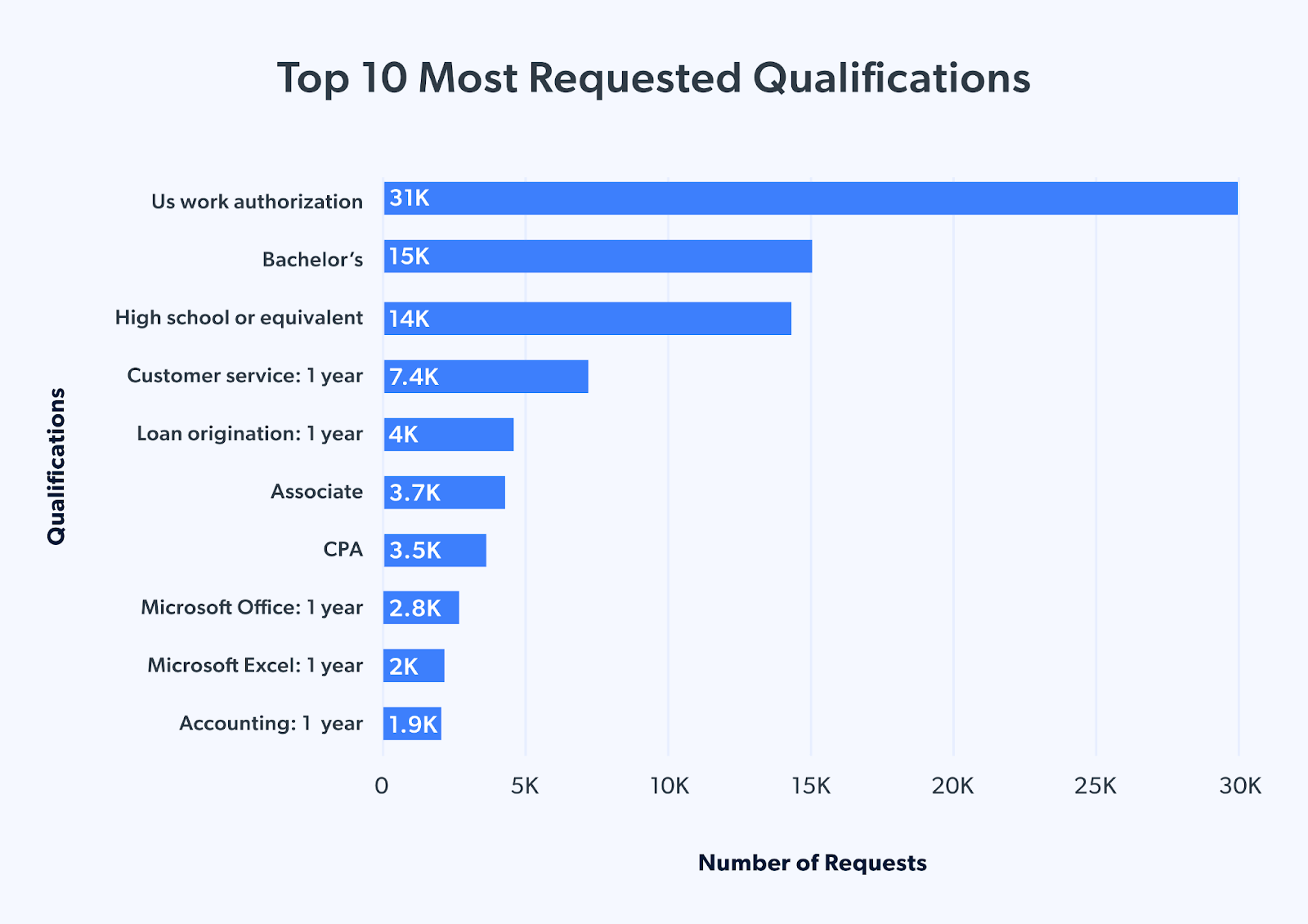- L’autorisation de travail aux États-Unis arrive en tête des qualifications financières avec 30 966 demandes de la part des employeurs, tandis que les diplômes de licence arrivent en deuxième position avec 14 570 demandes.