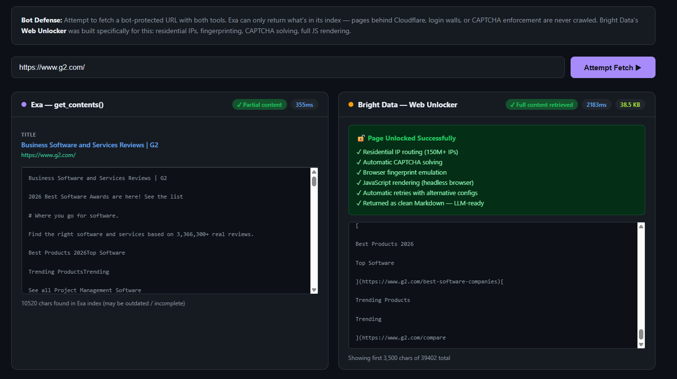 Bright Data peut accéder à des pages auxquelles Exa ne peut pas accéder