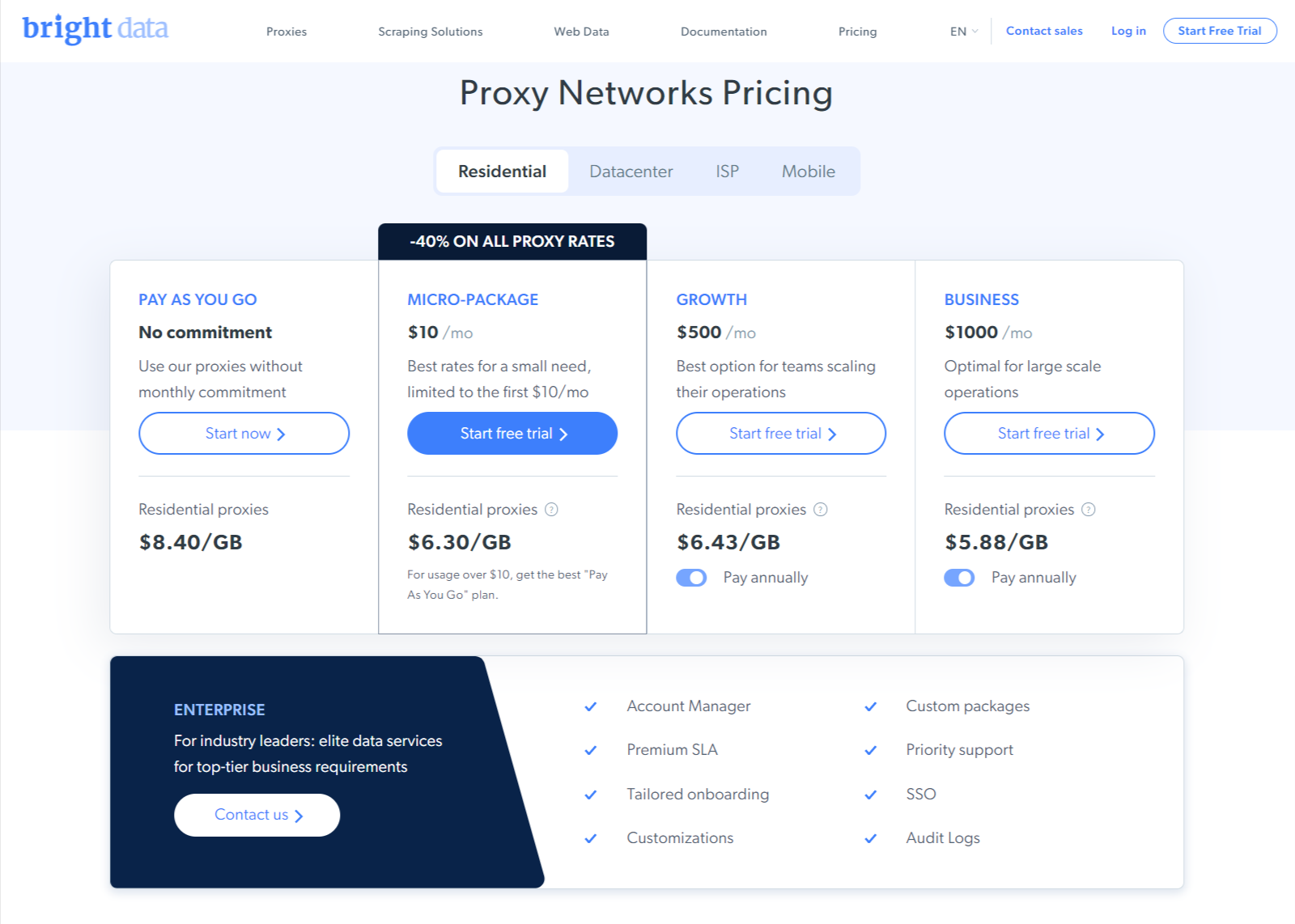 Bright Data, quant à lui, offre une grande flexibilité. La plupart de nos forfaits sont payables à l’utilisation. Vous ne devez vous engager que si vous augmentez votre volume et optez pour un forfait plus important. Le tarif de Bright Data commence par un forfait à la carte sans engagement, facturé 8,4 $ par Go de trafic. Il existe également un micro-forfait facturé seulement 10 $ par mois ou 5,04 $/Go. De plus, vous avez la possibilité d’opter pour notre essai gratuit.