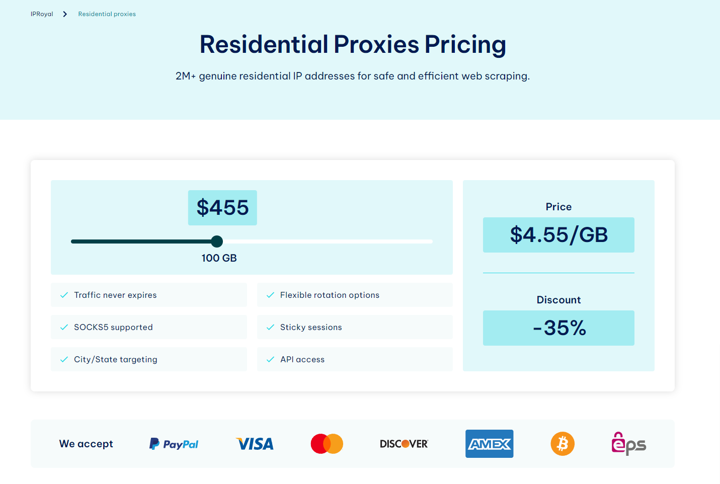 IPRoyal propose actuellement trois types de proxys (résidentiels, de centre de données et mobiles, avec un accent particulier sur les proxys destinés aux amateurs de sneakers). Au départ, l’entreprise proposait des proxys à un tarif moins élevé, mais suite à une hausse en 2022, ses prix se sont rapprochés de ceux des fournisseurs de milieu de gamme. Sa clientèle cible reste toutefois les petits utilisateurs, même si l’entreprise affirme être suffisamment fiable pour des projets à grande échelle.