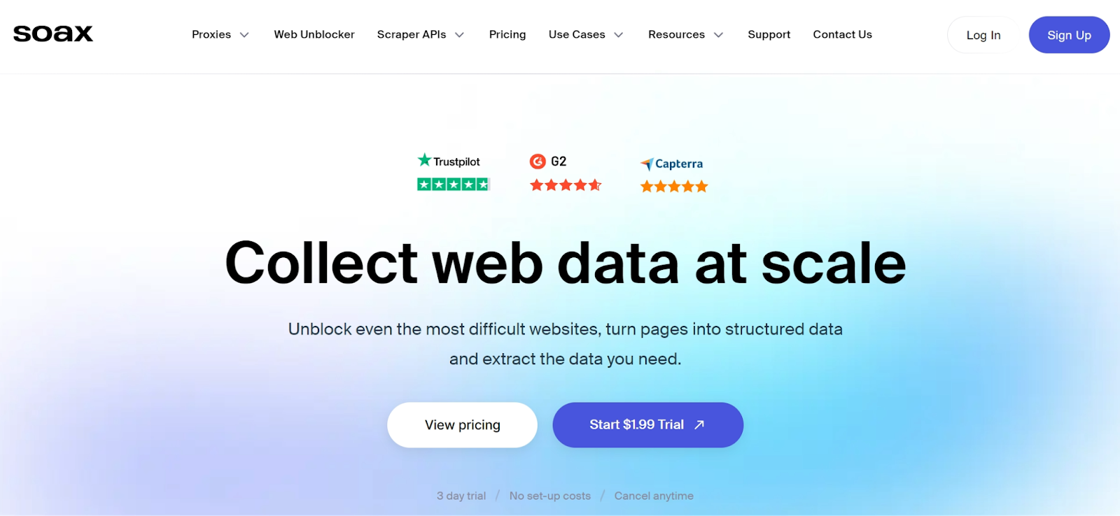 - Sur Trustpilot, Bright Data affiche une note impressionnante de 4,5/5 basée sur 628 avis, ce qui témoigne d’une forte confiance de la part de la communauté des utilisateurs. SOAX, en revanche, affiche une note de 4,1/5 basée sur 120 avis. Comme le reflètent les notes et le nombre d’avis, Bright Data est clairement le produit le plus fiable et le plus adopté par les utilisateurs.
