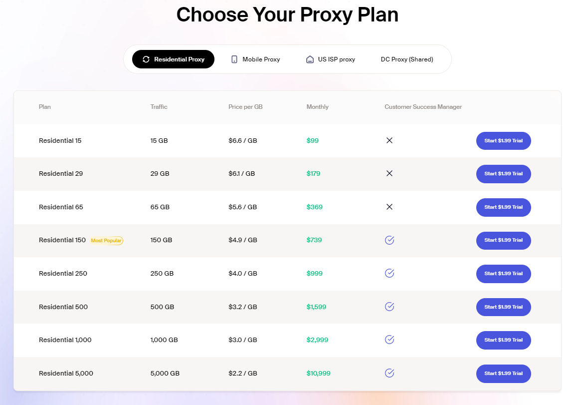 SOAX et Bright Data proposent tous deux plusieurs forfaits et niveaux pour leur service de Proxy résidentiel.