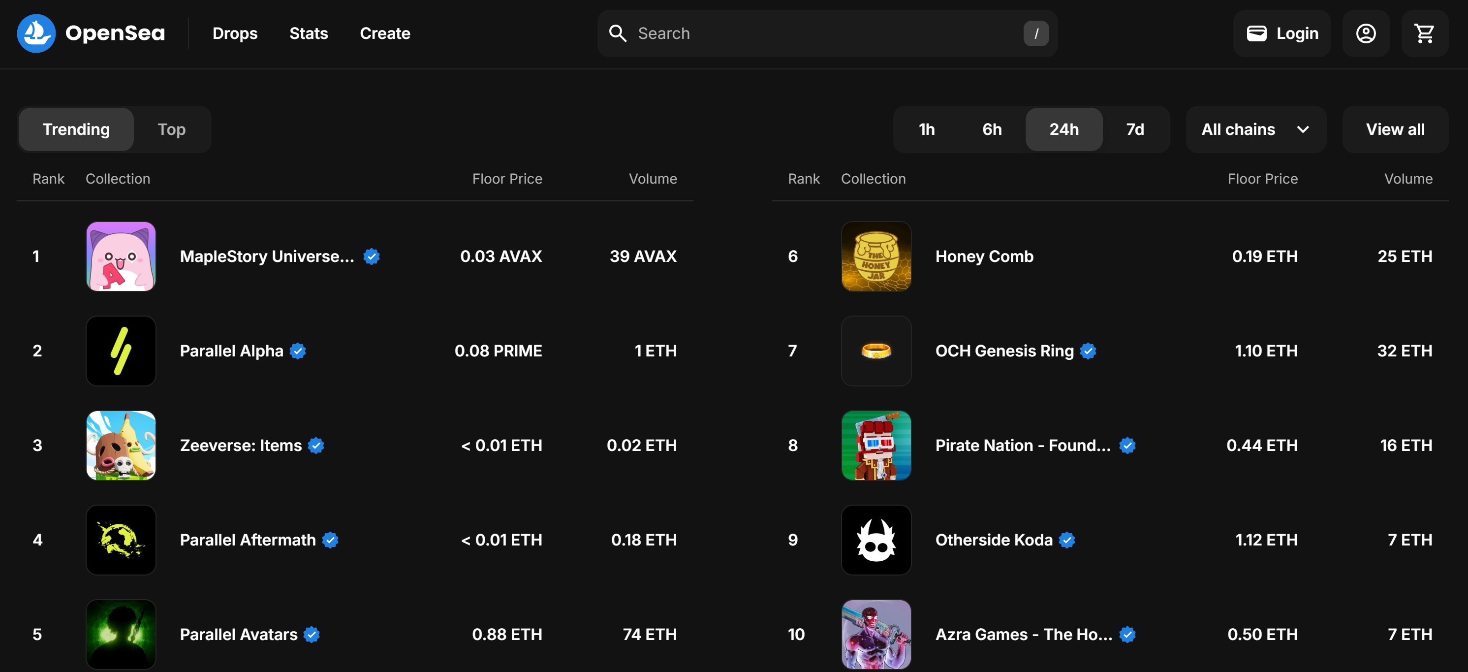 Par défaut, la page “Gaming” affiche les collections NFT “Trending” :