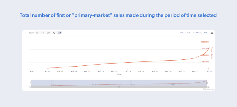 Les deux graphiques suivants présentent les données recueillies par Nonfungible.com, une plateforme majeure qui suit les transactions financières décentralisées (DeFi) telles que les NFT, les cryptomonnaies et d’autres classes d’actifs basées sur la blockchain DeFi. Bien que chaque graphique soit unique, les tendances sont étonnamment similaires. D’août 2017 à décembre 2021, le nombre de :