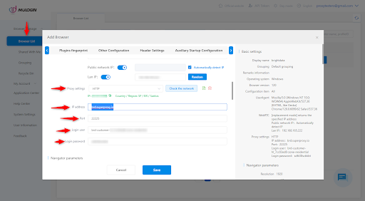 Ajouter un navigateur -> Configuration de base -> Paramètres du Proxy, remplissez les informations suivantes :