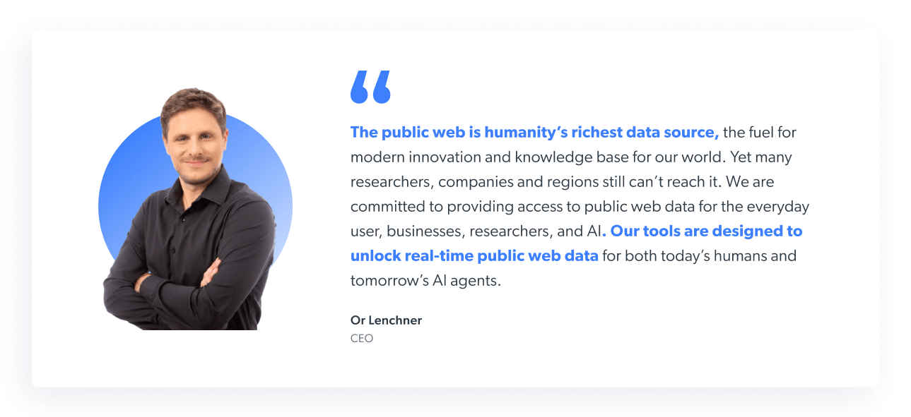 Our mission is to innovate as the ethical, responsible, and transparent leader of the web data infrastructure industry serving AI and & BI, while shaping the future of public data accessibility.