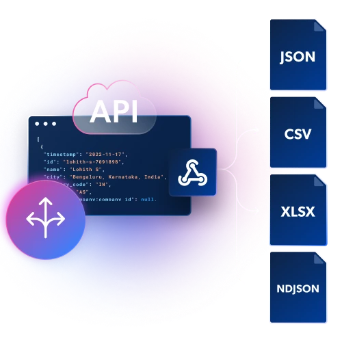 Obtenez des données structurées en fichiers JSON, NDJSON ou CSV via Webhook ou livraison par API.